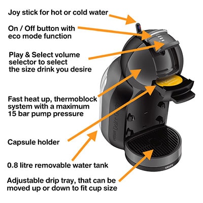 With a red cable contrasting with its matt black body and its compact, easily recognisable design, the Mini ME® puts together the best of both worlds in terms of quality and style. Incorporating a maximum 15-bar pump pressure, something you might not expect to find outside your local coffee shop, you’ll get consistently high quality results whichever NESCAFÉ® Dolce Gusto® coffee pod you choose.