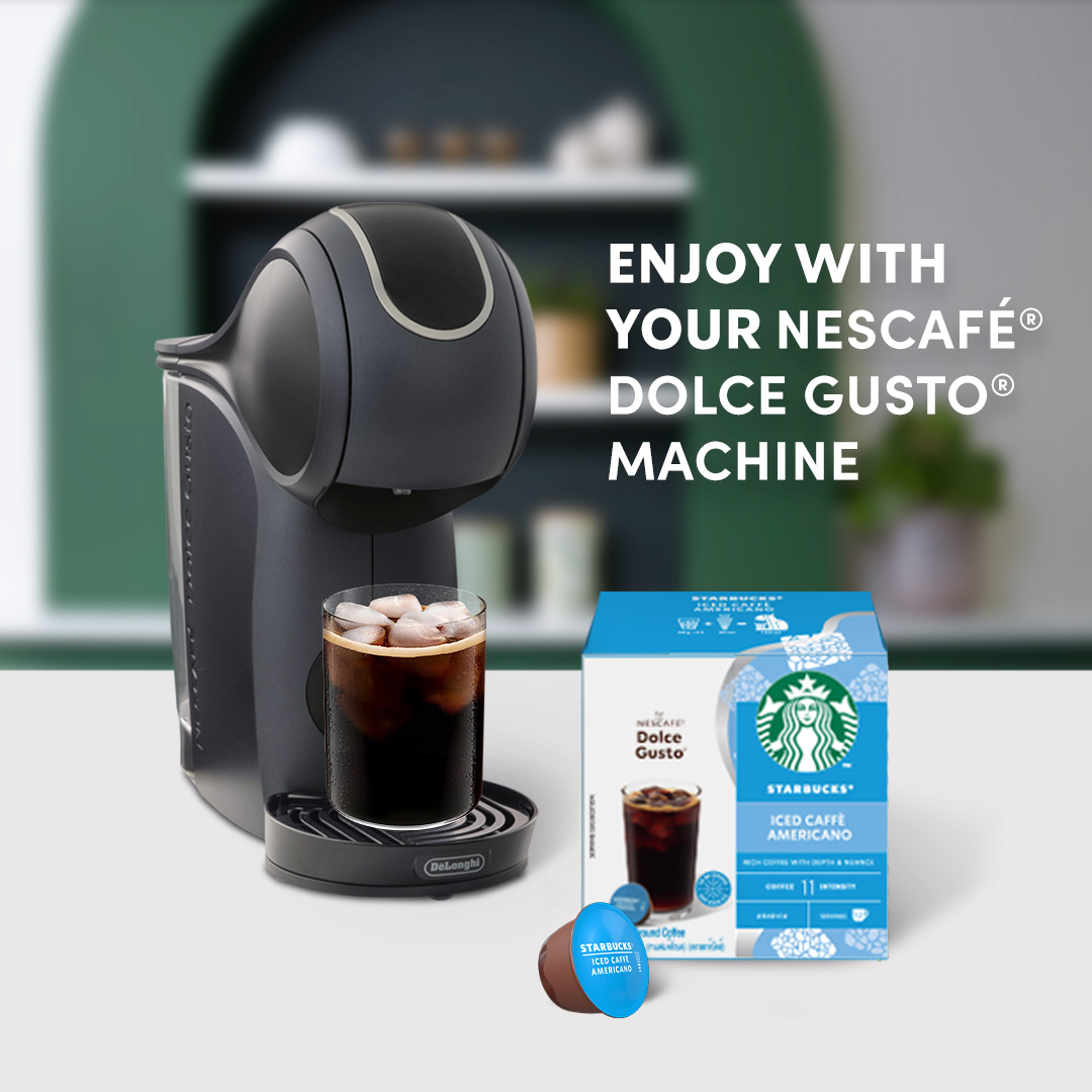 Simply slide your STARBUCKS® Iced Caffé Americano by NESCAFÉ® Dolce Gusto® capsule into your NESCAFÉ® Dolce Gusto® machine, and 90g of ice. Your coffee will be ready right away.